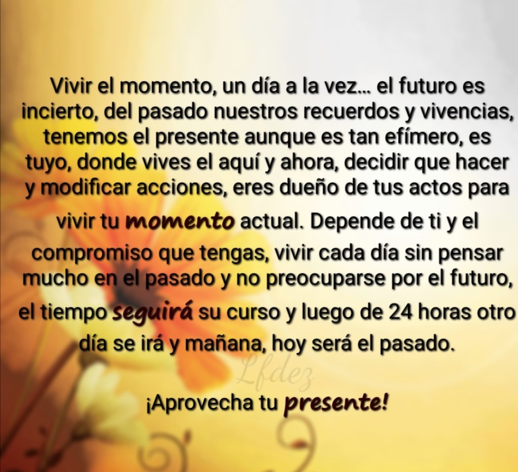 Vivir el momento, un día a la vez… El futuro es incierto, del pasado nuestros recuerdos y vivencias, tenemos el presente aunque es tan efímero, es tuyo, donde vives el aquí y ahora, decidir que hacer y modificar acciones, eres dueño de tu actos para vivir tu momento actual. Depende de ti y el compromiso que tengas, vivir cada día sin pensar mucho en el pasado y no preocuparse por el futuro, el tiempo seguirá su curso y luego de 24 horas otro día se irá y mañana, hoy será el pasado.