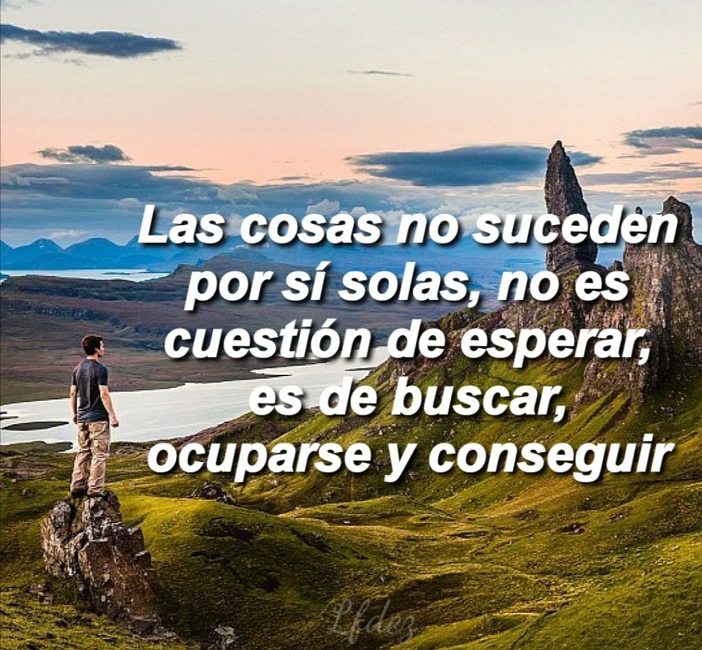 Las cosas no suceden por sí solas, no es cuestión de esperar, es de buscar, ocuparse y conseguir, si quieres que algo llegue a tu vida, no te quedes de brazos cruzados, tienes que moverte y conseguirlo con esfuerzo, ganas y dedicación, todos queremos una vida exitosa, espléndida, pero, ¿realmente hacemos lo adecuado para que eso ocurra? si tienes metas, pensamientos de optimismo y superación vas por buen camino, luego eso se debe concretar hacer cumplir nuestras metas, materializar, cuándo se obtienen logros, siempre irás por más, es superación para mejorar cada día y tener una calidad de vida que todos deseamos. No es simplemente sentarse a esperar, depende de cada persona y lo que haga con su vida para lograr conseguir ese título que tanto quiere, ese empleo que tanto anhela, de su proactividad para emprender, de sus actitudes y aptitudes para mantener dentro de su vida a seres especiales, de sus valores, depende de uno, de ti, no de los demás, recuerda el tiempo pasa y ese es el único que no espera nada. Aprocha tu vitalidad, tus mejores años, tu tiempo.